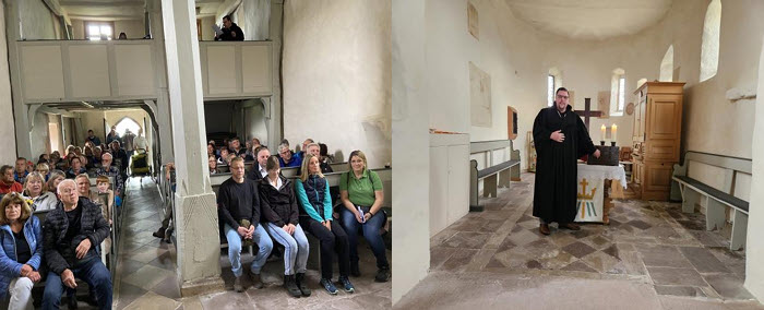 Bevor die erste Tour losging, gab es noch eine Stärkung vom Grill. Um 13 Uhr begann die geführte Wanderung entlang des Weges. Ein kurzer Zwischenstopp wurde in der Kapelle am Schönberg gemacht, wo Sebastian Jacobmeyer eine Geschichte zu verschiedenen Sagen erzählte.