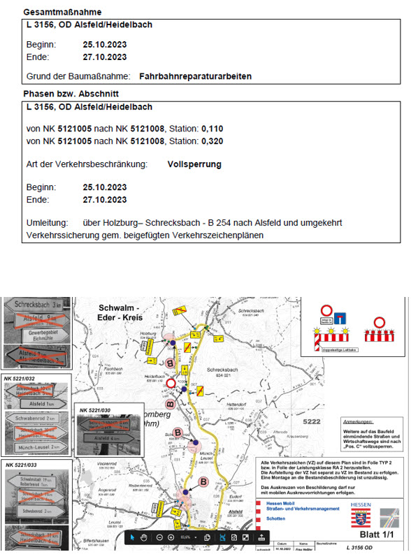 Aufgrund von Fahrbahnreparaturarbeiten kommt es im Zeitraum 25.10.2023 – 27.10.2023 zur Vollsperrung der L 3156 OD Alsfeld/Heidelbach.